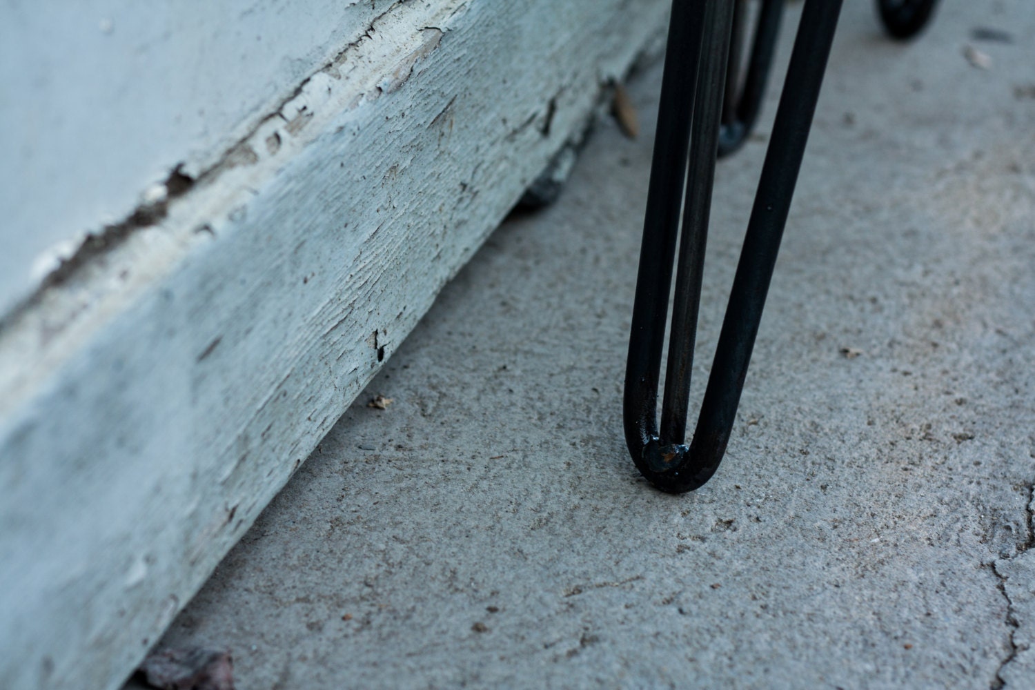 The solid reclaimed oak seats on these stools are charred by hand for a classic textured ebony look that still highlights the character and grain of the old wood. They are then sealed with multiple coats of satin lacquer for a burnished, hand-rubbed look. Paired with the industrial steel hairpin legs and old iron railway spikes, the completed picture is a sexy blend of elegance, strength and raw sensual appeal.