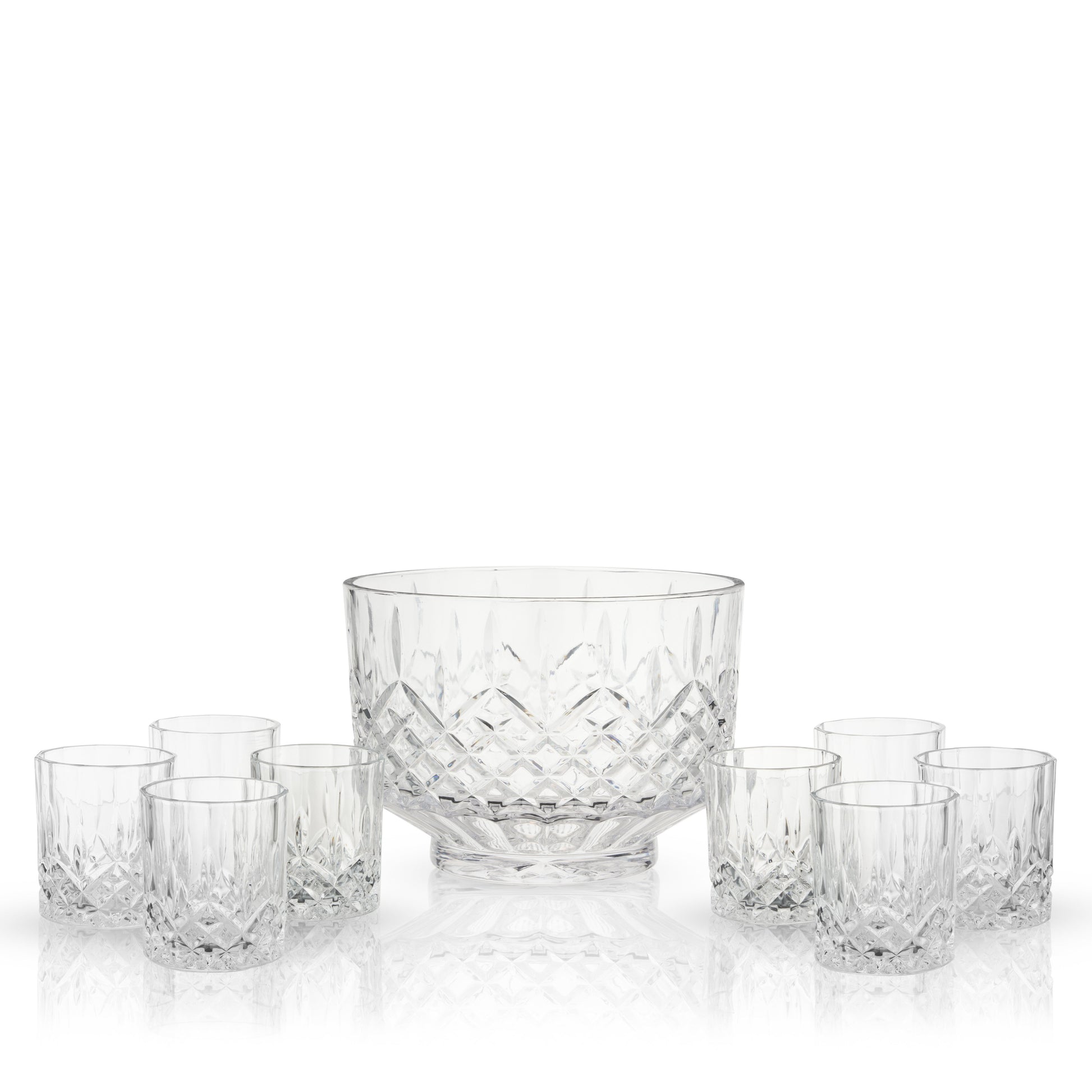The generous size and cut-crystal details of this punch bowl set make it a beautiful serving centerpiece that recalls vintage barware. It comes with 8 matching tumblers—perfect for entertaining.