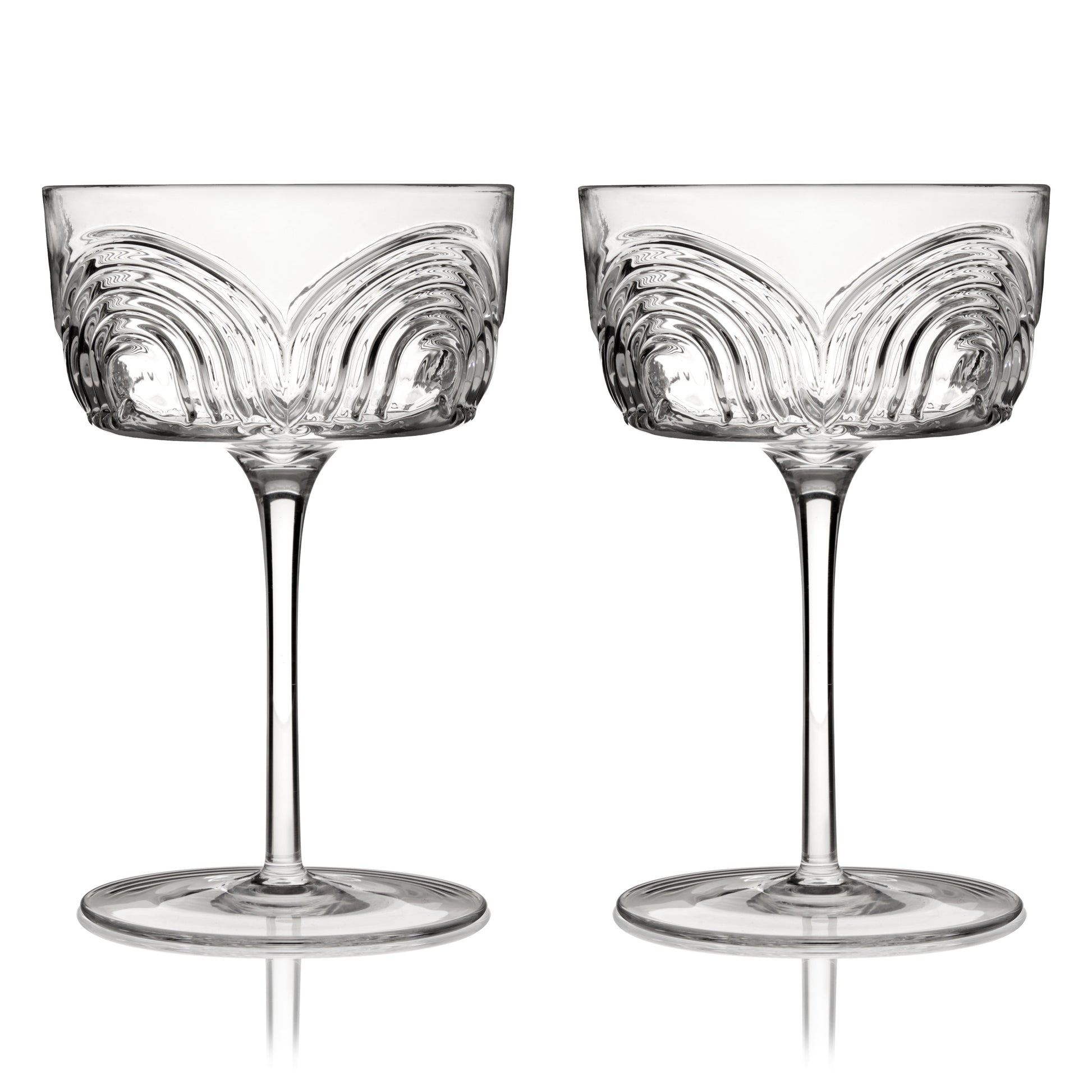Featuring an angled bowl, classic stem, and sweeping textured arches, these crystal cocktail coupes are inspired by the delicacy and detail of the Art Deco era. Add some 1920s style to your Martinis, Champagne, or Manhattans with this cocktail glassware set.