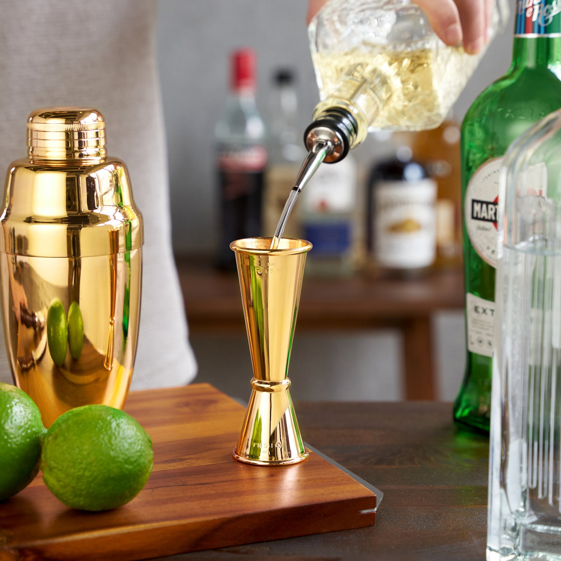Cast in lustrous gold with a band that separates its one- and two-ounce sections, the interior of each side of our professional Japanese-style double jigger is scored with pinpoint mixology measurements (1.5, 0.75 and 0.5 ounces).