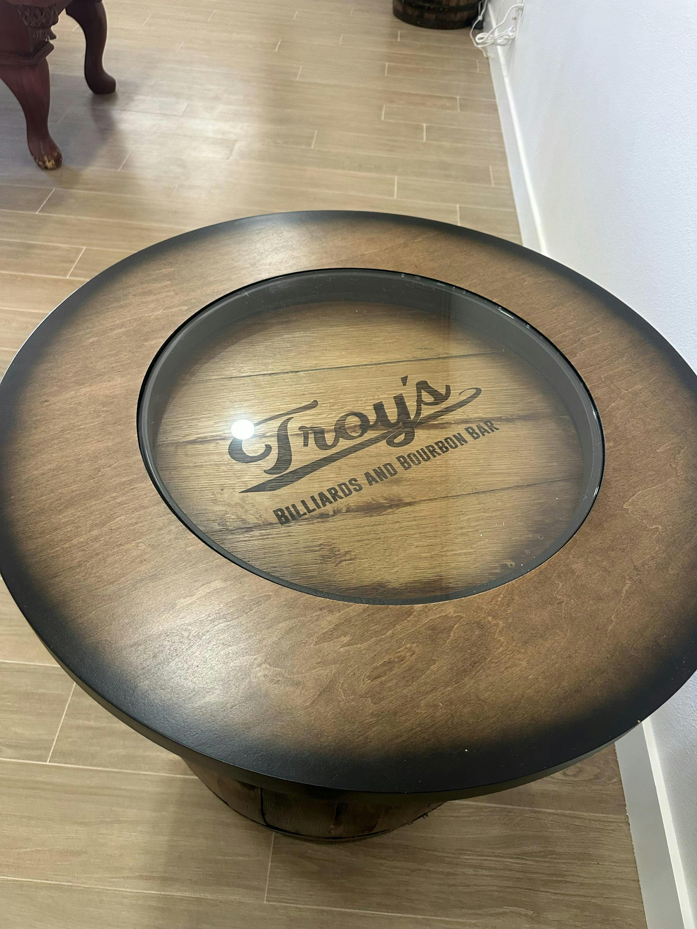 Custom, made-to-order bistro/bar/pub table made from a real bourbon whiskey barrel. The tabletop can be laser engraved with just about whatever you want; your favorite bourbon logo, your last name, your company logo, anniversary date, you name it, we’ve probably done it. Alternatively we can cut out the center of the tabletop so a piece of glass can be inserted to reveal the barrel head, which can display the original stamp on the barrel, a custom laser engraved design, or be used like a shadow box to display momentos. Additional images of previous engraving designs can be found on our Facebook page at http://www.facebook.com/thewwco or by viewing other items in our Etsy store. Feel free to reach out prior to purchase to see if we can accommodate your design. If you select the engraving option we will create an original design for you and offer 2 revisions to get it just how you want it.