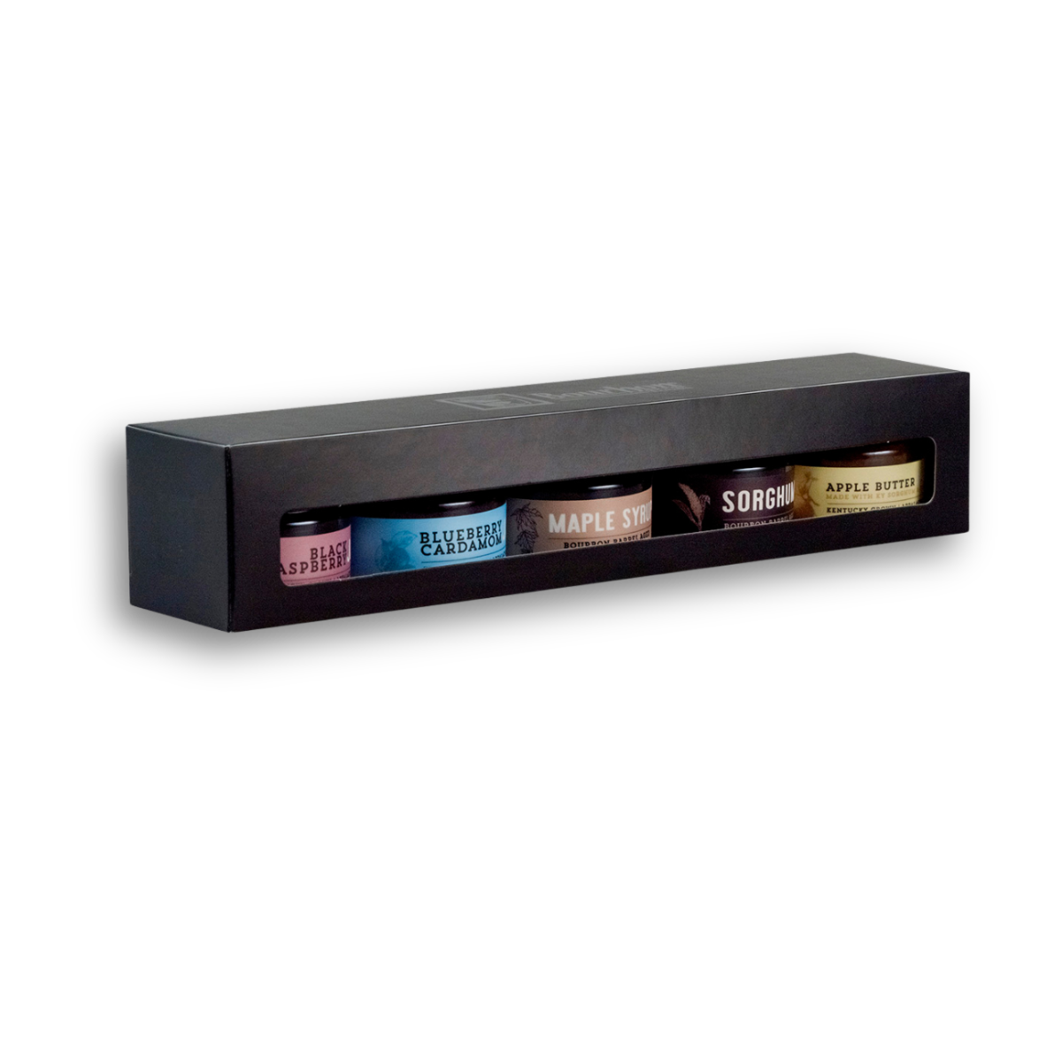 Five 1oz Jars of each flavor: Apple Butter Spread, Black Raspberry Jam, Blueberry Bourbon Cardamom Jam, Bourbon Barrel Aged Maple Syrup, Bourbon Barrel Aged Sorghum