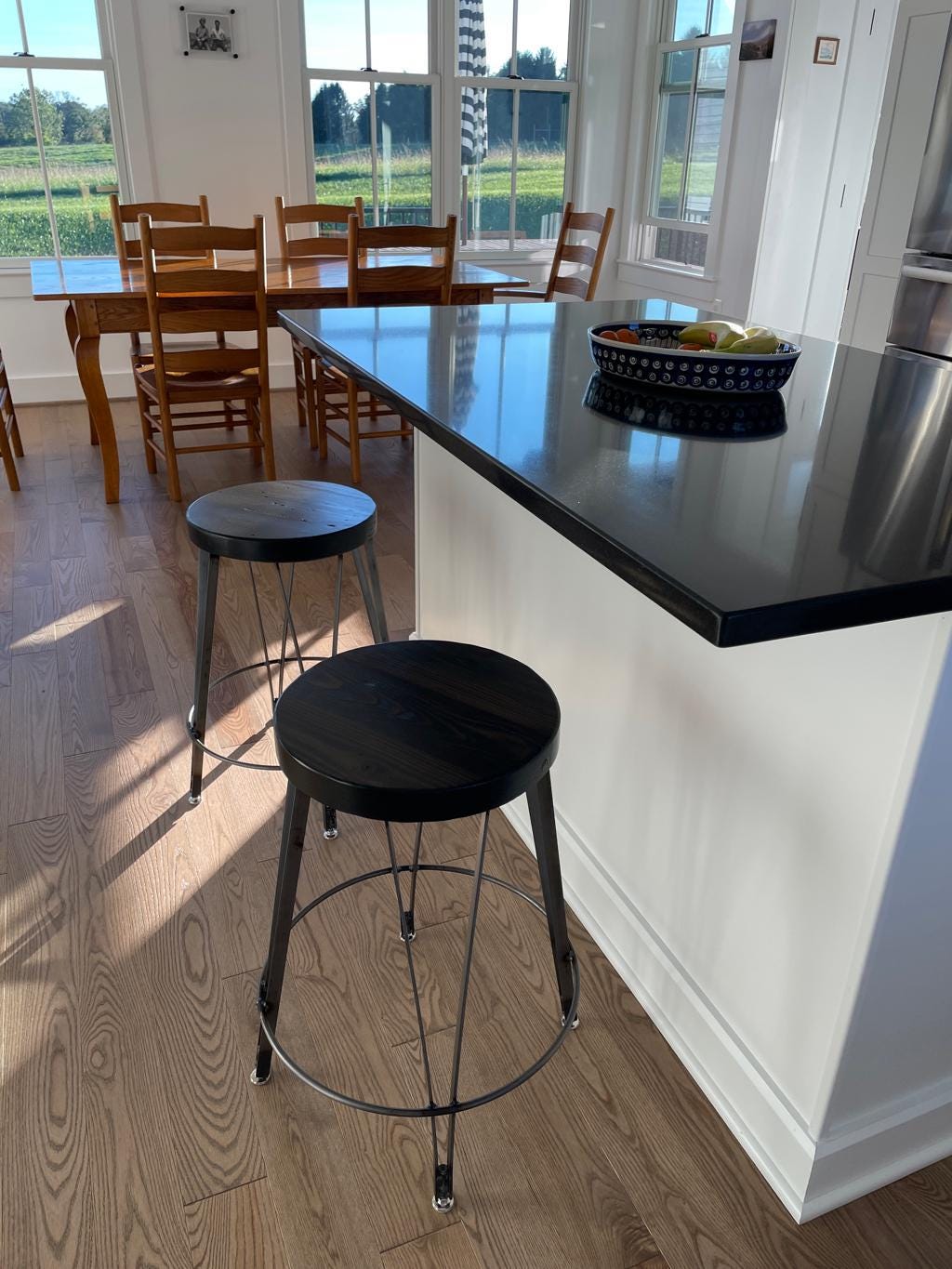 Pictured here with seats at 30 inches high, stained Provincial brown, these are made at the time of ordering and so can be customized to your specific needs.