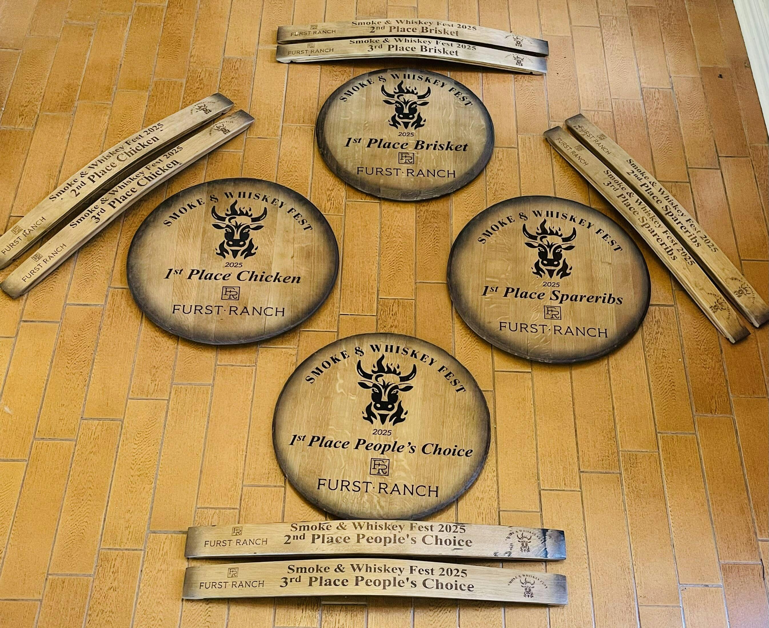 Custom laser engraved barrel heads make great gifts! Your purchase includes up to an hour of design time with one of our graphic designers to get the design dialed in for you. Barrel heads are approximately 22 inches in diameter, 1 inch thick and solid white oak. They are from real, used whiskey or bourbon barrels and will be charred on the back. We sand and seal both sides of the head so you need not worry about any loose char rubbing off. We also install a wall hanger on the back. Feel free to reach out prior to purchase to discuss the feasibility of your design. info@thewhiskeyworkshop.com
