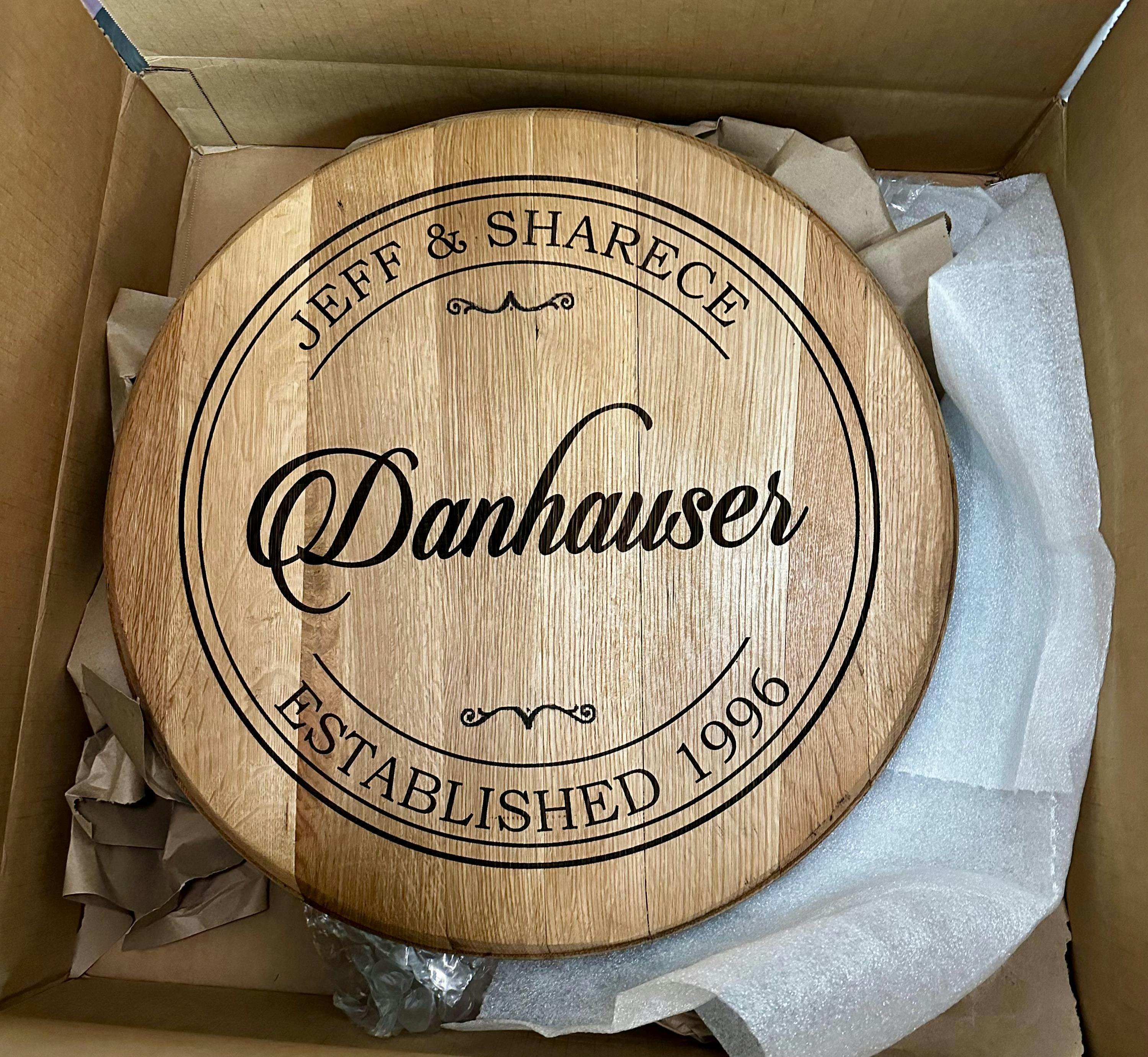 Custom laser engraved barrel heads make great gifts for newlyweds to commemorate their big day or can be used as wedding guestbooks. They also make great anniversary or retirement gifts. Your purchase includes up to an hour of design time with one of our graphic designers to get the design dialed in for you. You can opt to go with one of our existing designs or we can come up with something completely new and unique. Barrel heads are approximately 22 inches in diameter, 1 inch thick and solid white oak. They are from real, used whiskey or bourbon barrels and will be charred on the back. We sand and seal both sides of the head so you need not worry about any loose char rubbing off. We also install a wall hanger on the back. Feel free to reach out prior to purchase to discuss the feasibility of your design. info@thewhiskeyworkshop.com