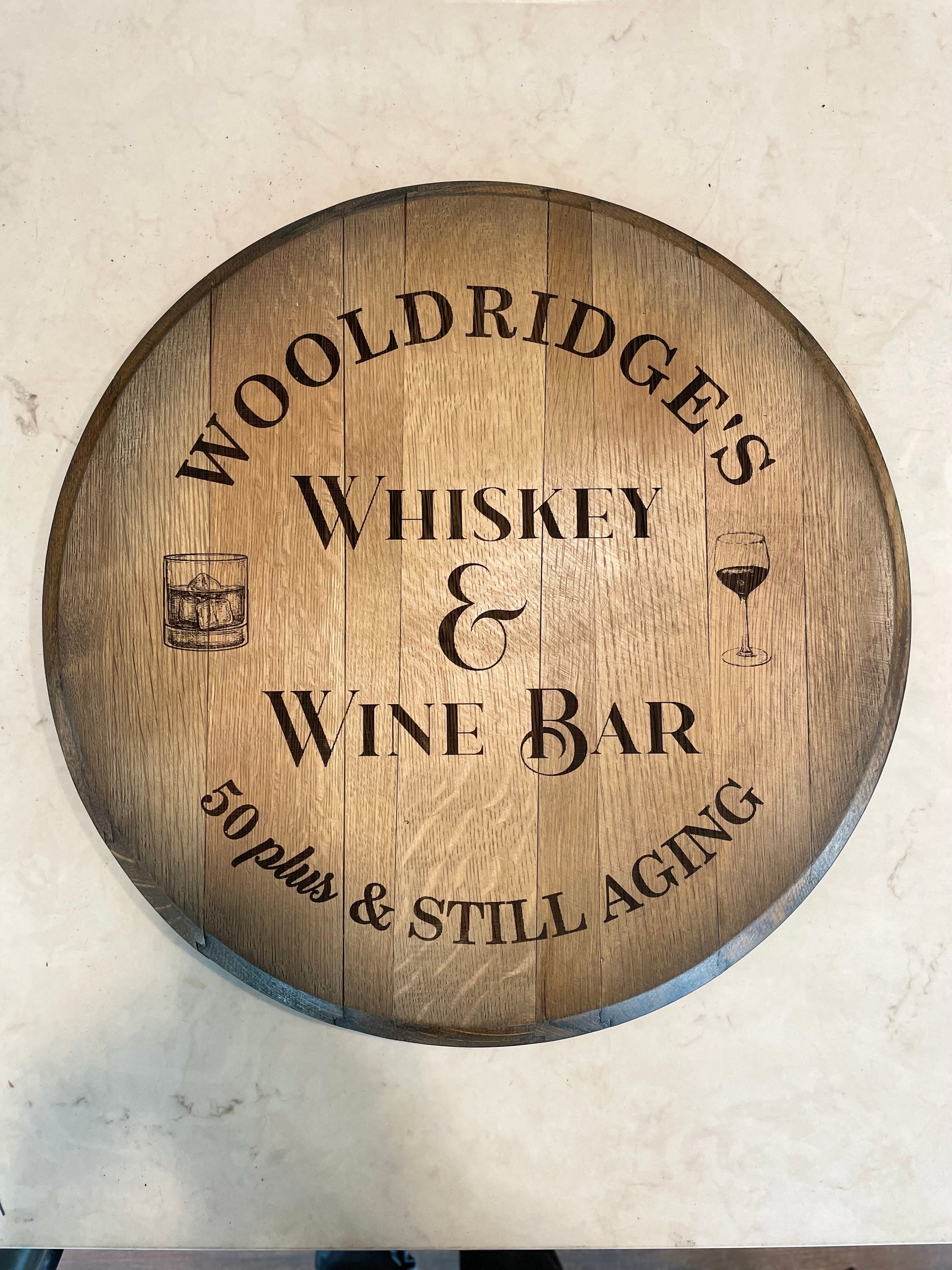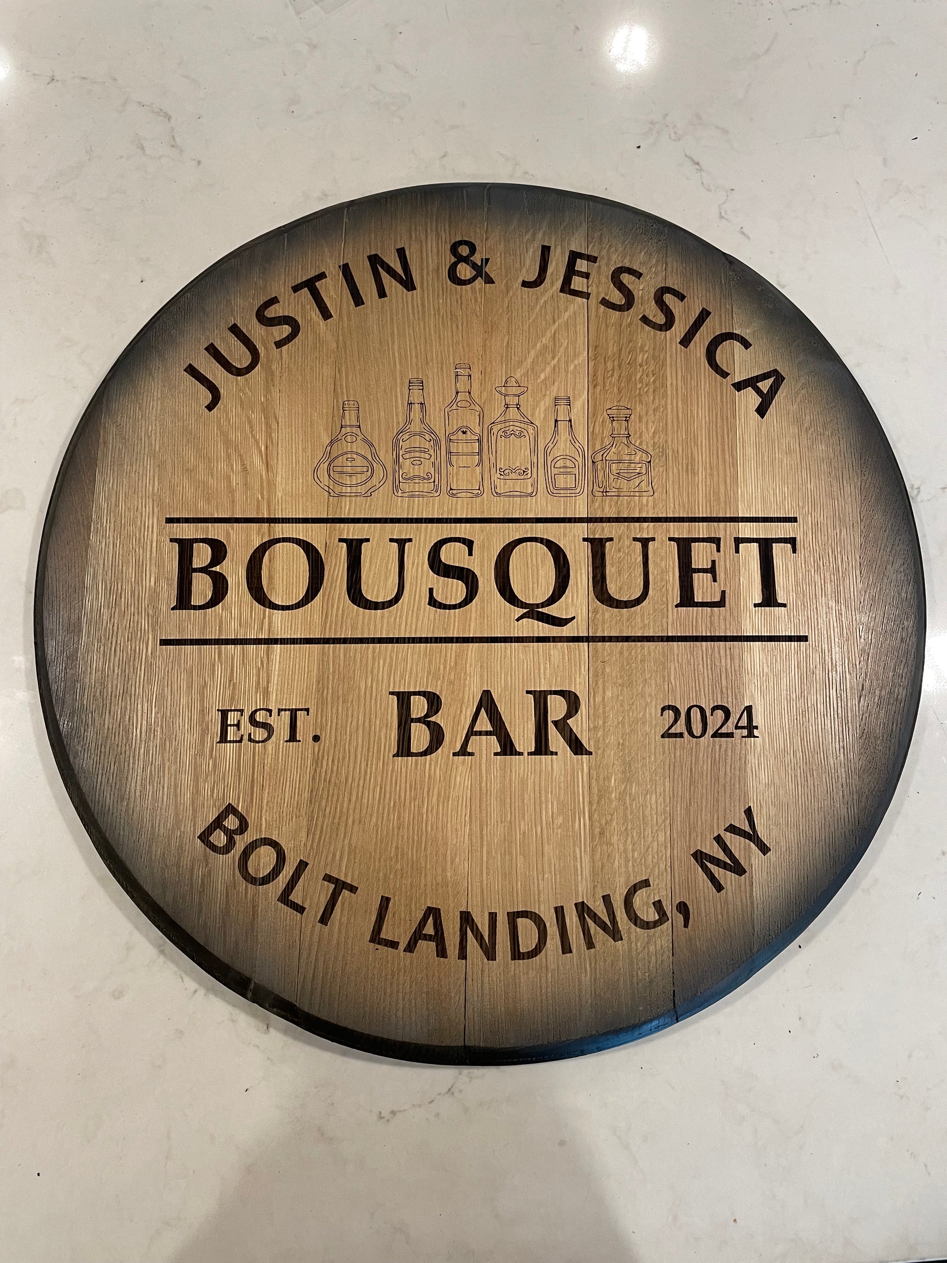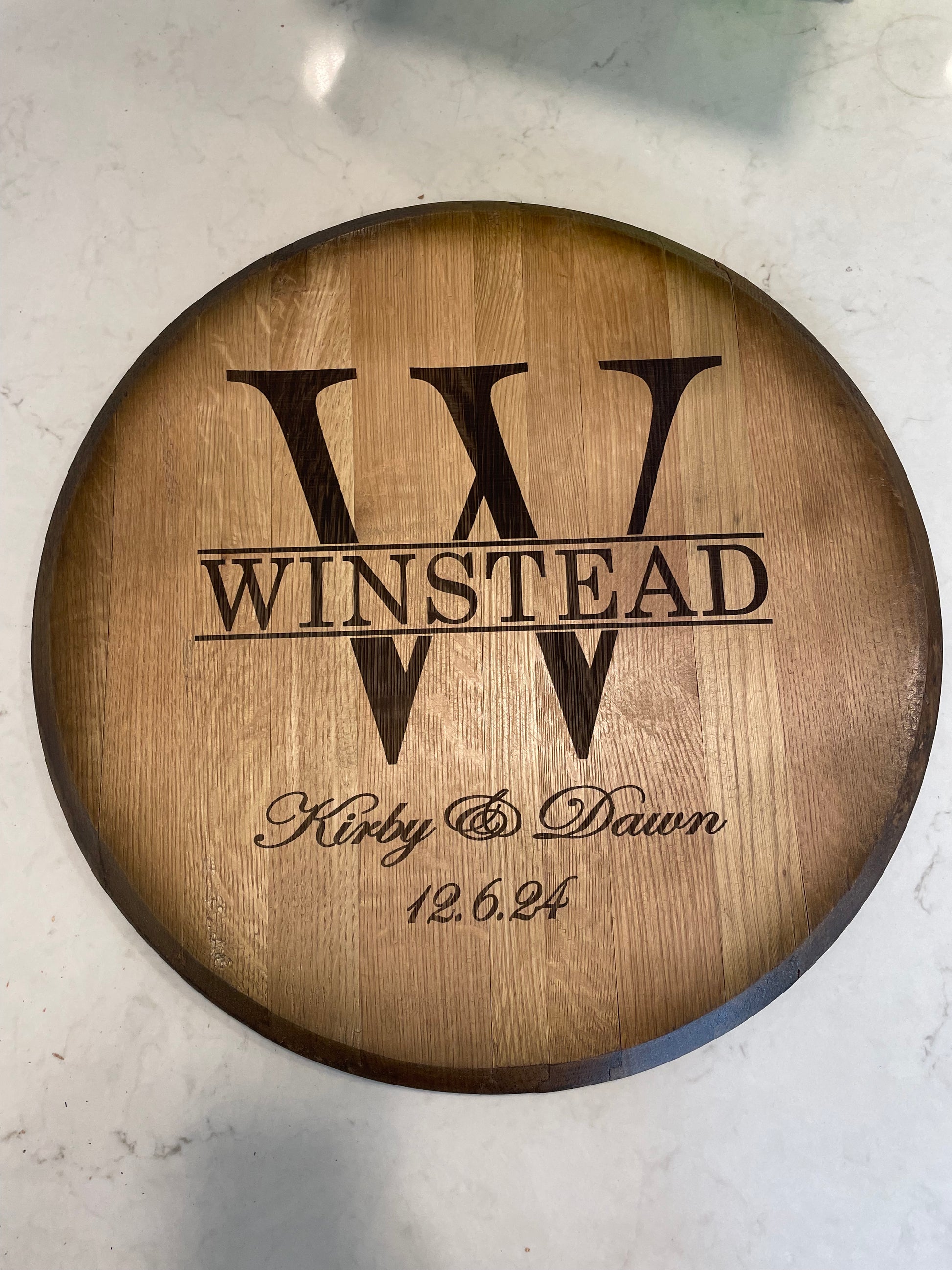 Custom laser engraved barrel heads make great gifts for newlyweds to commemorate their big day or can be used as wedding guestbooks. They also make great anniversary or retirement gifts. Your purchase includes up to an hour of design time with one of our graphic designers to get the design dialed in for you. You can opt to go with one of our existing designs or we can come up with something completely new and unique. Barrel heads are approximately 22 inches in diameter, 1 inch thick and solid white oak. They are from real, used whiskey or bourbon barrels and will be charred on the back. We sand and seal both sides of the head so you need not worry about any loose char rubbing off. We also install a wall hanger on the back. Feel free to reach out prior to purchase to discuss the feasibility of your design. info@thewhiskeyworkshop.com