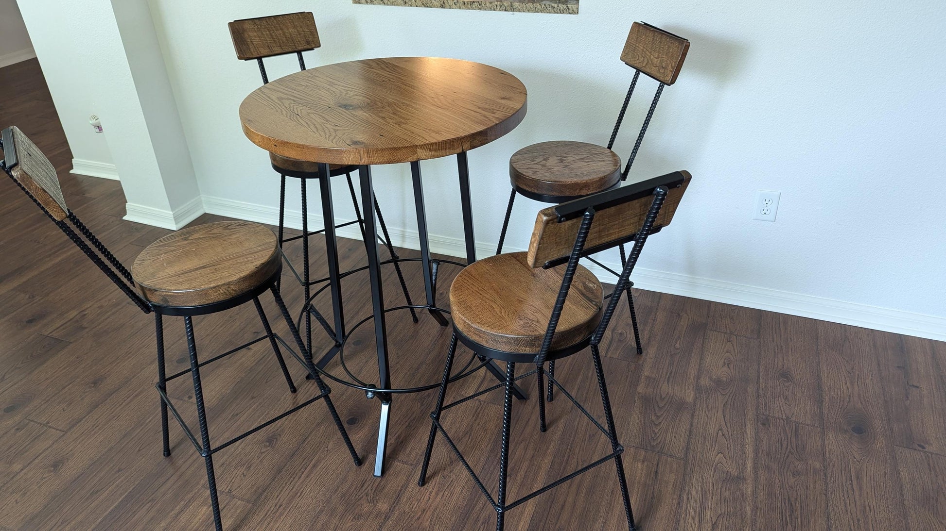 Perfect for your breakfast nook, eat-in kitchen or sidewalk cafe, this table is pictured at 42" high and a 30" round thick plank top made from vintage oak sealed with a clearcoat, though of course custom sizing, stains and woods are always available. This listing is for the table only, ask us about matching stools!