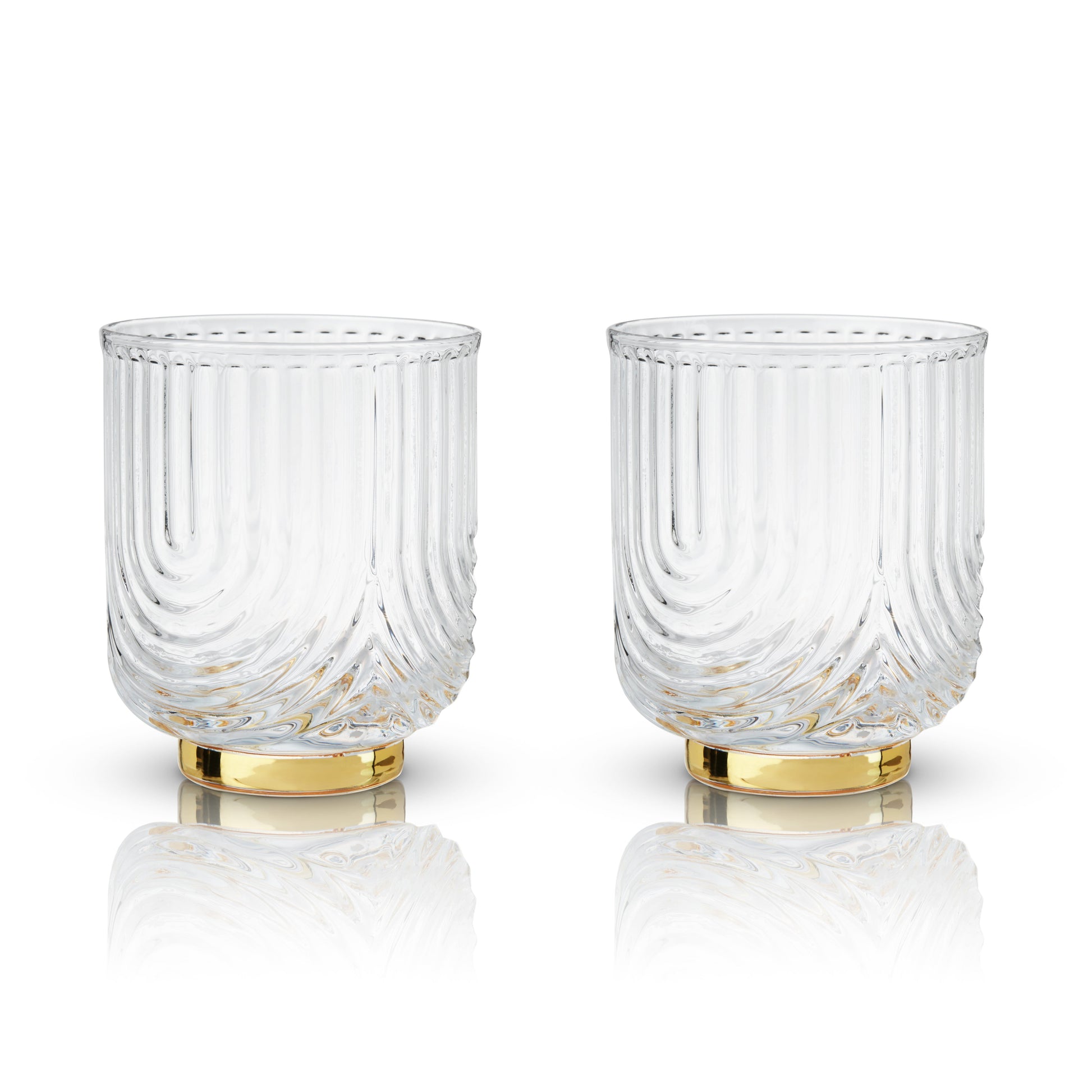 Polished gold and draping glass swathe the surface of this double old fashioned duo, adding a vestige of the Gilded Age to an already elevated set of glassware.