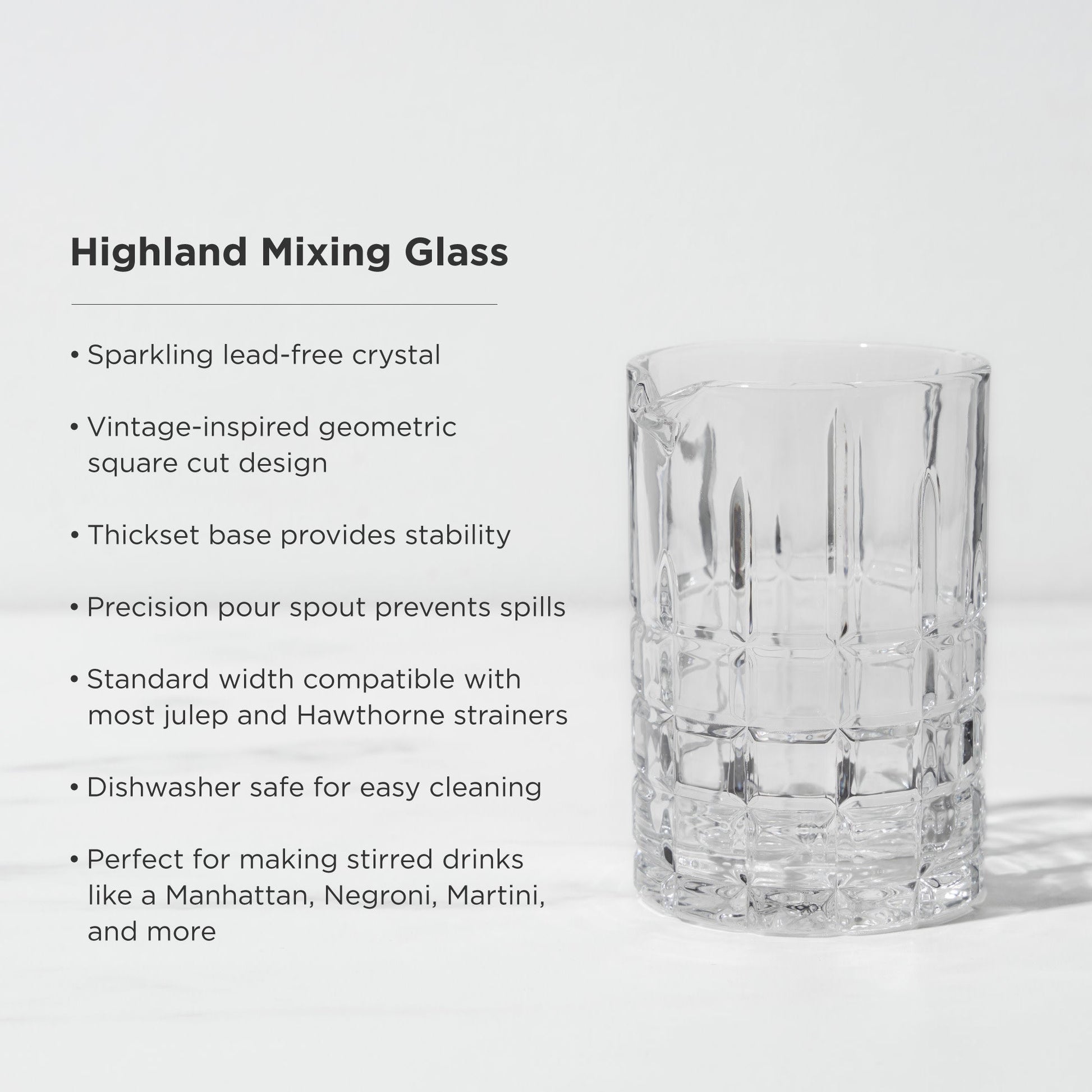 Designed and sized for expert bartending, this 18 oz mixing glass accommodates about two drinks and works smoothly with our bar spoons and strainers. Features a thickset base, precision pour spout and geometric square-cut details.