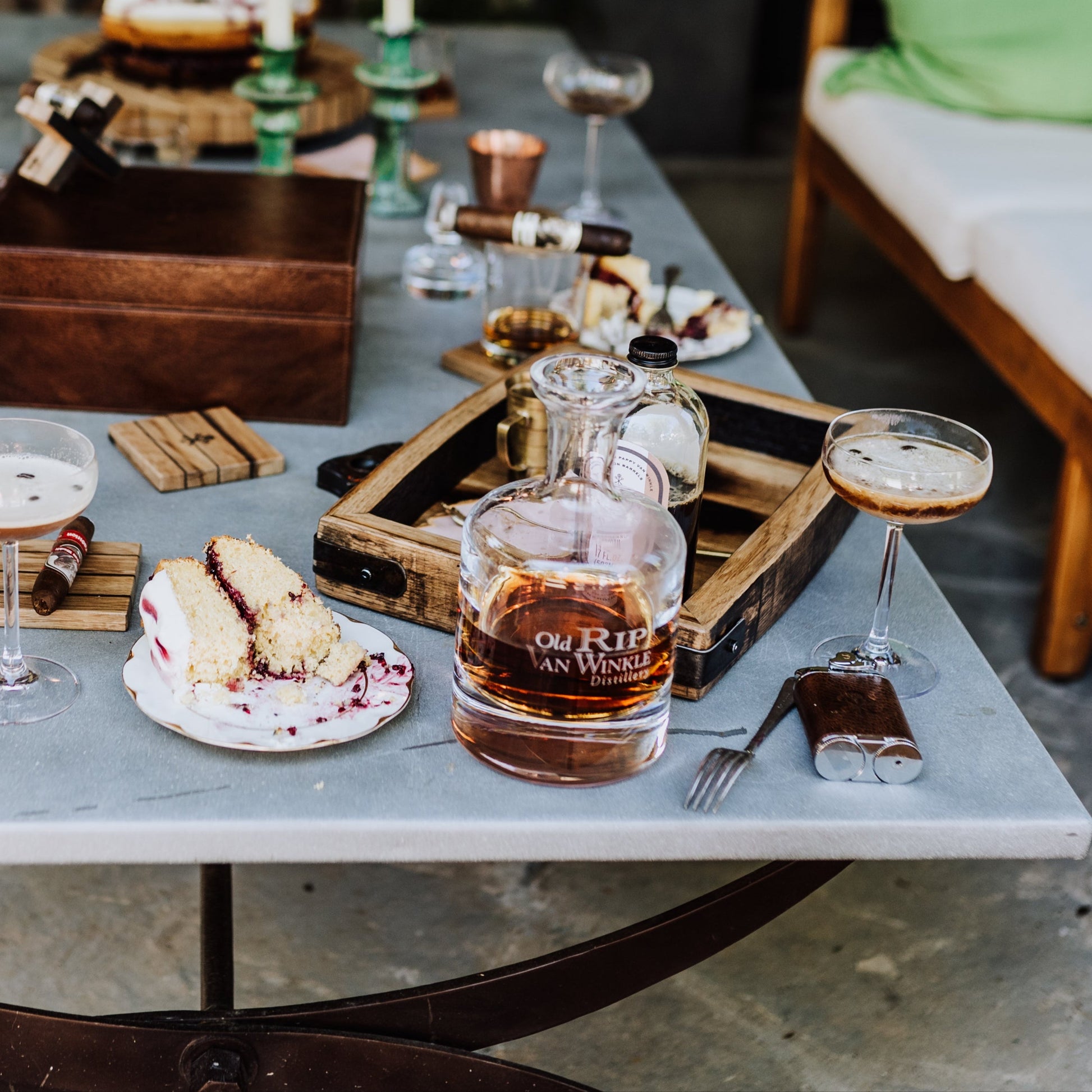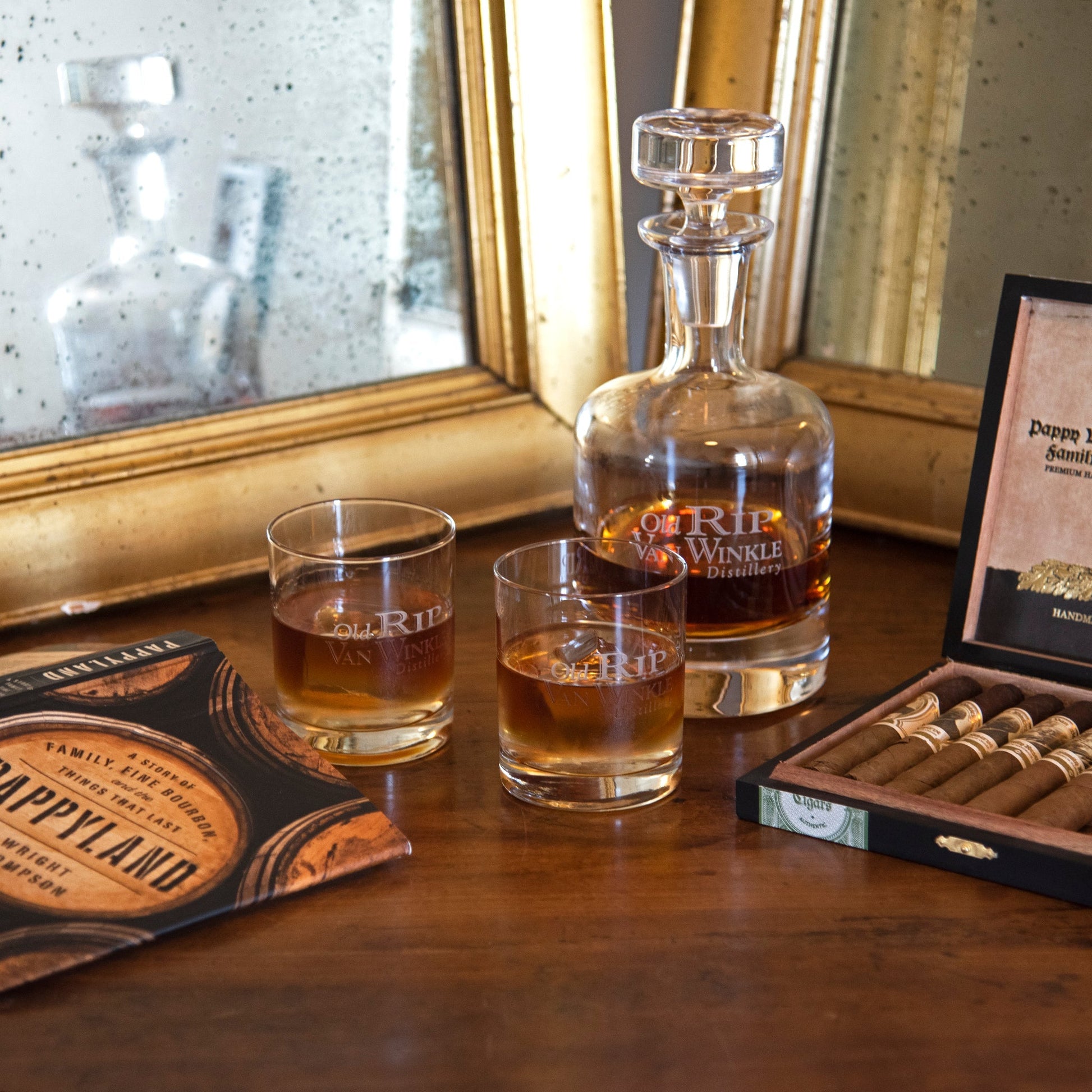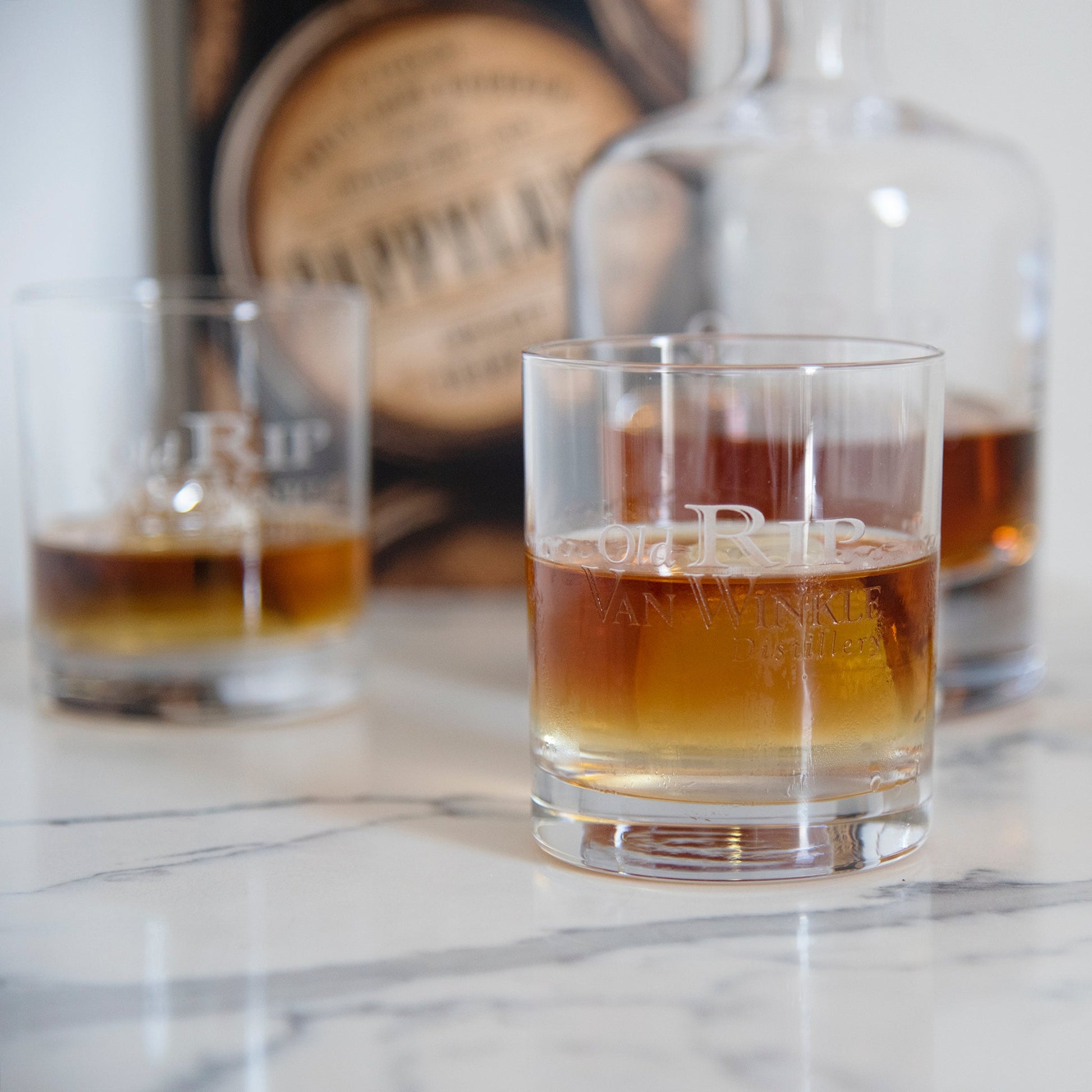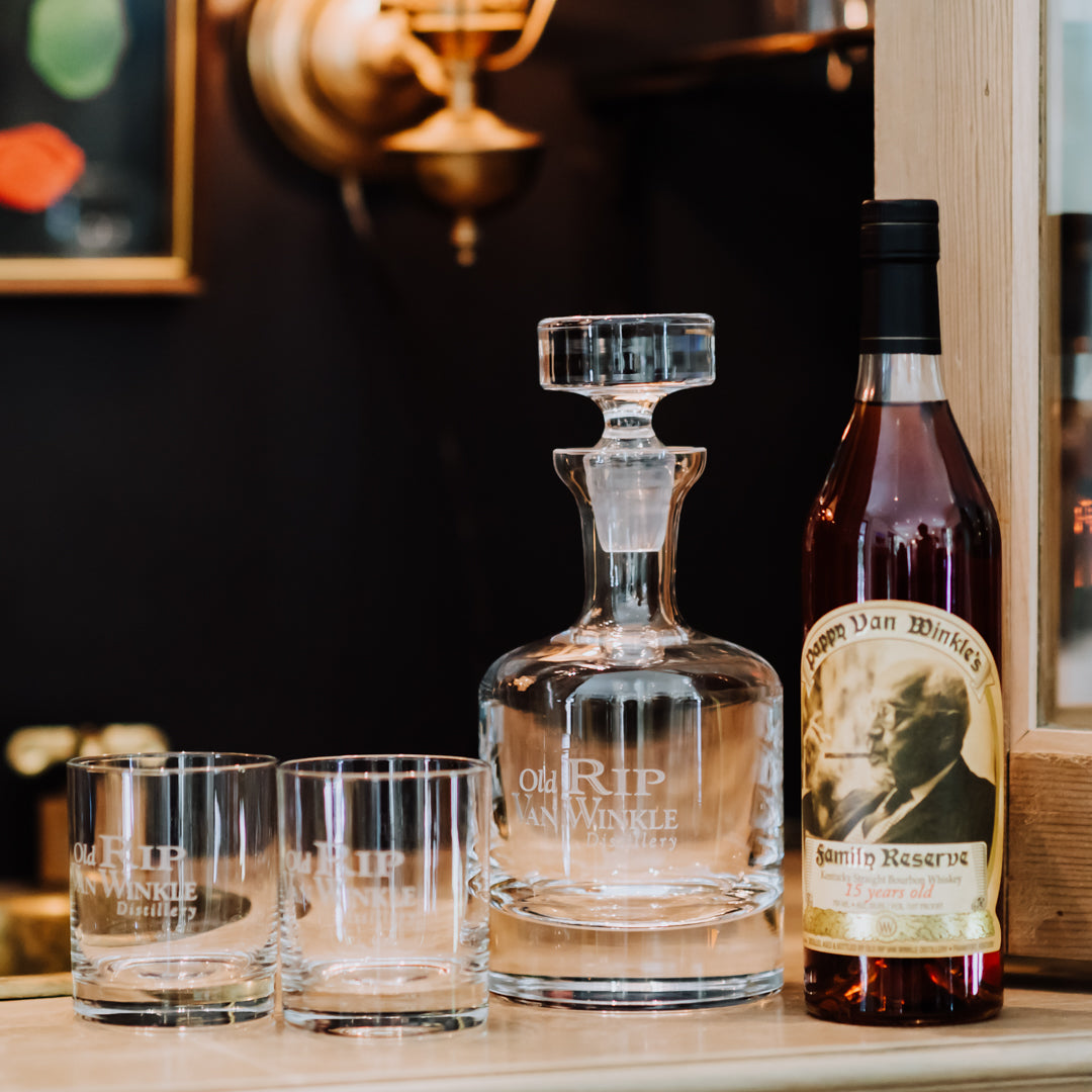 This beautiful 3-piece home bar set is a tribute to that part of our bourbon heritage and includes one 26-ounce bourbon decanter and a set of two 10-ounce rocks glasses, all etched with the classic Old Rip Van Winkle Distillery logo. The set still makes a great gift, and thanks to the versatile shape of both the decanter and glasses, it works for whiskey and wine lovers alike.