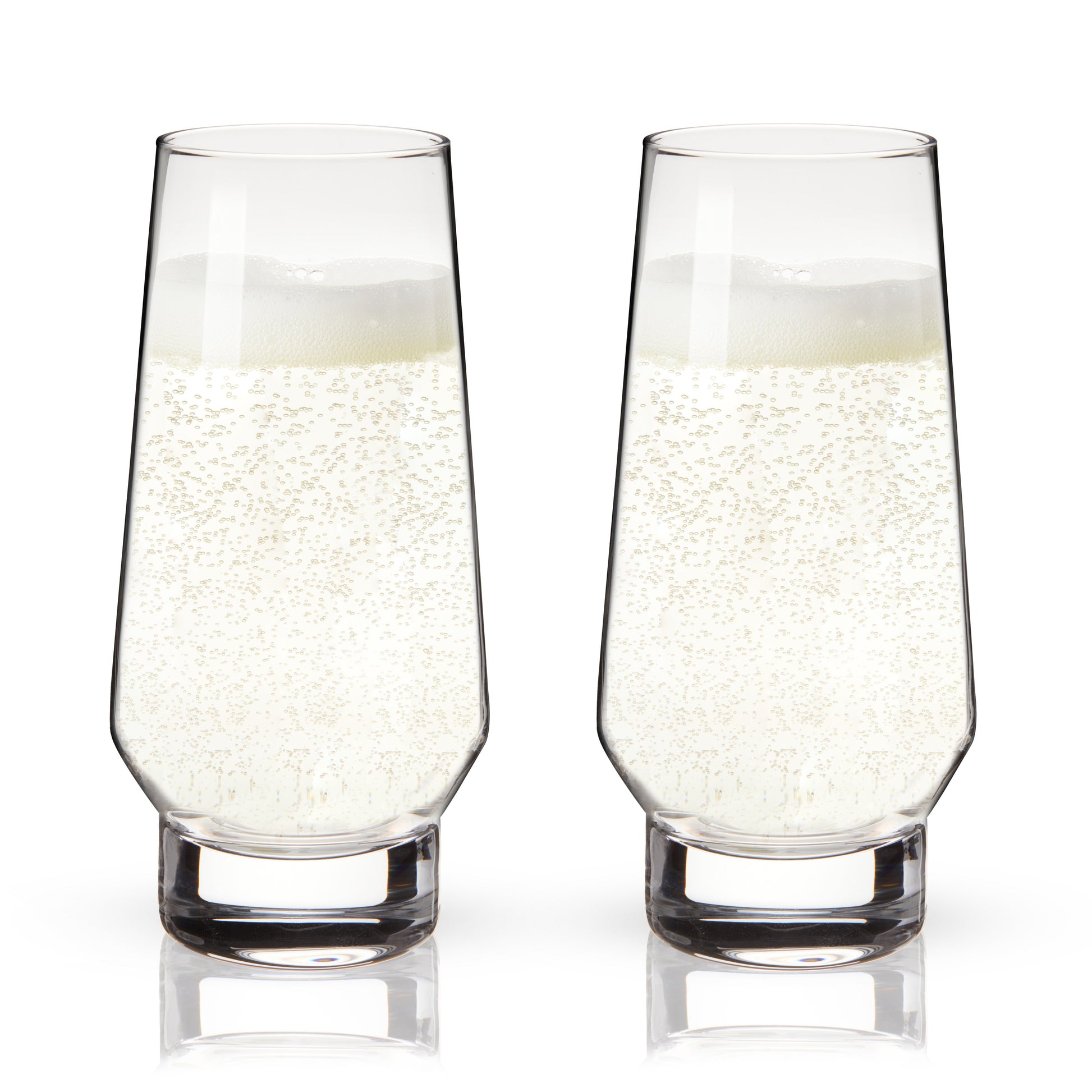 With a tapered rim, rounded silhouette and heavy base, these crystal champagne flutes have a modern look and substantial stemless base, ideal for your favorite prosecco, a simple mimosa, or elaborate Champagne cocktails.