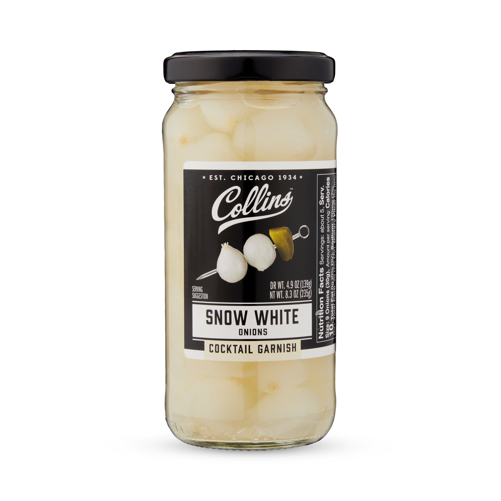 A signature garnish of the Gibson, Bloody Marys, or any other classic cocktail that calls for an onion, these pickled white onions are silvery white in color and mildly sweet in taste. They are also one of the best garnishes for classic cocktails, like the Gibson. Pickled in vinegar, Collins Snow White Onions are the perfect finishing touch to cocktails and other drinks.