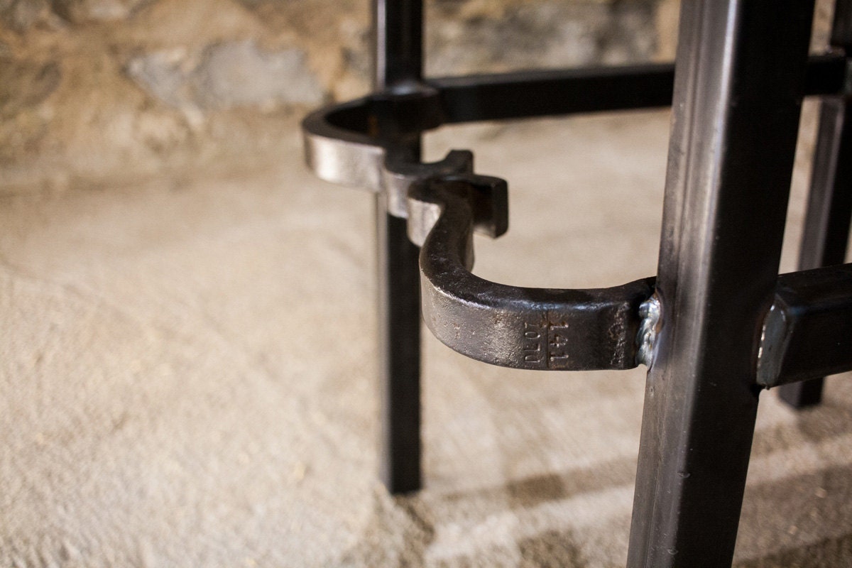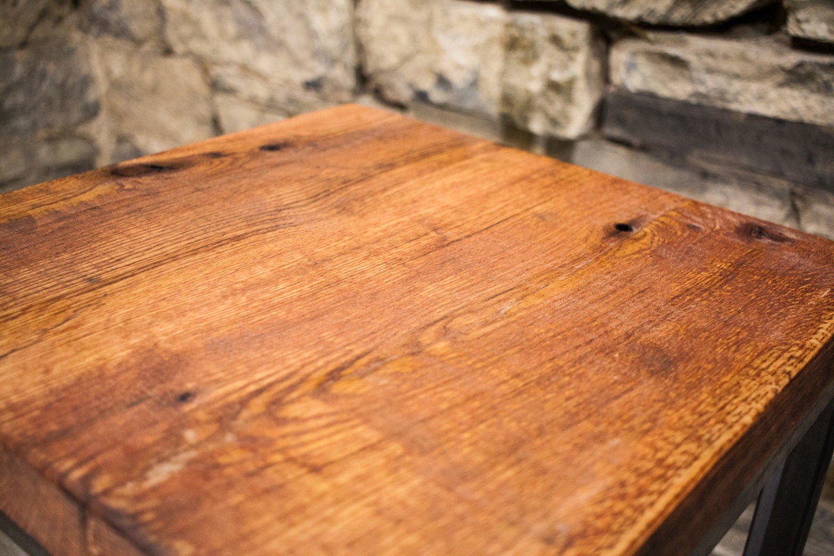 Pictured here with a Gunstock stained reclaimed wood seat and raw industrial steel base.