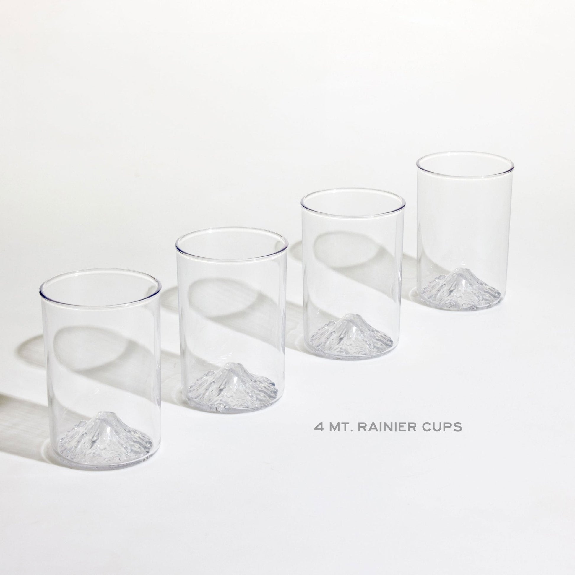 Set of four unbreakable plastic 12oz cups featuring accurate 3D Data of Mt. Rainier standing at 14,411 ft molded into the base of the cup.